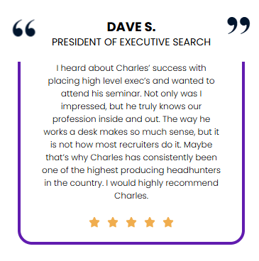 Discover the exact step-by-step system Charles used to generate $1M+ every year. Charles was the first recruiter under the age of 30 to bill over $1M in 1998 and consistently has done since! Discover the exact step-by-step system Charles’ uses to generate $1M+ year after year.