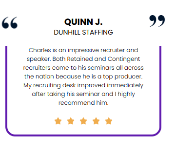 "Charles comes highly regarded by the Management Recruiters International (MRI) family.  What is unique about his seminars is that he is a full time succesfull recruiter who does seminars for fun. Charles brings pesent day information and techniques that work everytime and I highly recommnd him"